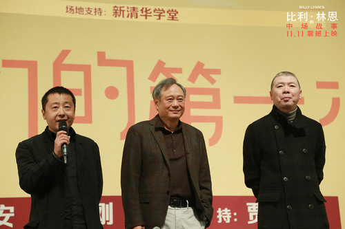 11月7日晚,电影《比利·林恩的中场战事》在清华大学举办了中国首映第二场活动——“我们的第一次”李安冯小刚对谈,贾樟柯导演特别担任本次活动的嘉宾主持。在近两个小时的对谈中,李安导演与冯小刚导演畅聊与电影有关的话题,从自己的新作到对电影的探索,从技术的突破到对演员的指导,无所不包,让现场观众享受了一场关于电影的“视听”盛宴。整个对谈过程中,三位导演互动不断,气氛轻松愉快。李安导演更用“形式和内容一样重要”“除了电影,我只想烧烧菜,被太太数落”“还是拍电影比较安全”“美国电影有点僵硬了”等一句句经典语录赢得现场同学的阵阵掌声。