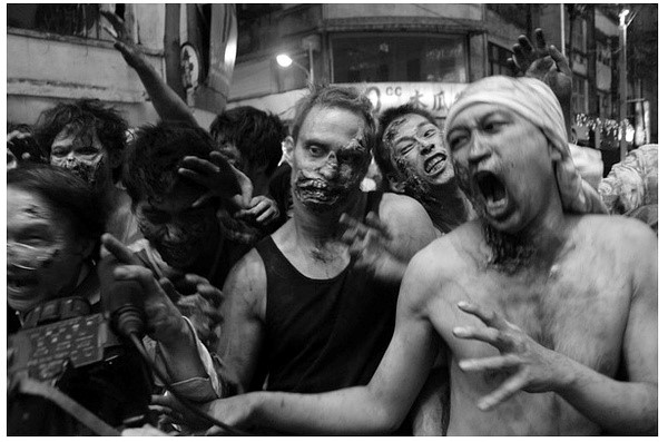 钱人豪:只能这样讲,因为很多人不知道过程,我没有办法去解释为什么要这么拍。比如有的演员只来一天,观众会问怎么这个演员为什么不见了?因为他是来客串的。戏里面有个演员杜宇航,他到台湾来宣传叶问的一部电影,就抽空来两天;高捷来一个早上,我只能抓短短几个小时来拍。包括很多活尸是临时演员,他们都是来帮忙的,有的拍到一半要回去喂孩子了,或者不见了,或者拍的太辛苦本来有五百个人,拍啊拍可能剩二百个,剩一百,剩五十个,有很多原因。最后我们除了摄影师以外,连灯光师都下午演活尸了,包括我都下去演。所以我觉得作为导演是没有资格也没有机会允许去和观众解释是为什么,因为观众只看到结果。