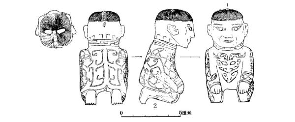 妇好墓双性玉人上肢采用了不同的姿势,男性为双臂下垂,女性为双臂环抱于下腹部。江苏朝墩头M12的玉人可算作是这件双性玉人双臂环抱的雏形。良渚文化先民的社会分工已经相当细化,那些玉工、陶工有高超的艺术表现能力,但是他们没有足够的能力在二维载体上表现三维图像,甚至一、二千年后的商周时期依然如此。因此,所谓“作弯曲状,抬臂弯肘”,实际上要表现的是“双臂环抱”,只是二维图像不能显示清晰的立体感。