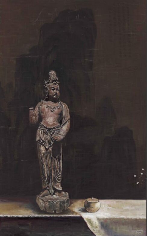 占据画面最大面积的是中国历代名画或者画作的局部。经过油画的诠释,画面给人一种熟悉的陌生感。但是,巧铭没有画得很实,而是注重画面的气氛和调子。这些作为背景的古画,给人一种渐行渐远的感觉,就像“过去”,逐渐退为人生的背景。但是,佛像的处理方式完全不同,画的非常坚实、细腻,甚至有点超级写实的意味,与佛像题材刚好吻合。巧铭画的佛像,不是她自己创作的佛像,而是现成的佛像雕塑,就像她画的背景山水,不是她创作的山水,而是山水画。山水画重气氛和意境,可以画得较虚;雕塑本身就是三维,适合画得较实。但是,我看重的还不只是题材与语言的配合,而是寓意与语言的配合。如果说作为背景的山水画象征对“过去”的追忆,作为主题的佛像雕塑又象征什么呢?诚然,这些佛像雕塑也是过去时代的产物,就像那些作为背景的绘画作品一样。但是,如果我们将佛像作为信仰对象来看的话,它们就永远不会过去。佛不仅不会过去,而且始终作为理想存在于“未来”的时间维度之中。尽管“未来”与“过去”一样,都不是我们直接经验的时间维度,但是它们给我们的印象全然不同:“未来”总是清晰的,“过去”总是模糊的。这不仅因为时间是由“过去”向“未来”推移,“未来”变得越来越清晰,“过去”变得越来越模糊,更重要的是“未来”是憧憬的理想,“过去”是已逝的追忆。“过去”是业已存在者留下的痕迹,它们或深或浅,或明或暗。但是,“未来”不同。作为尚未实现的理想,“未来”是没有区别的完满。巧铭将佛像画得很实,将国画画得很虚,不仅与题材有关,而且与它们唤起的时间感有关。
